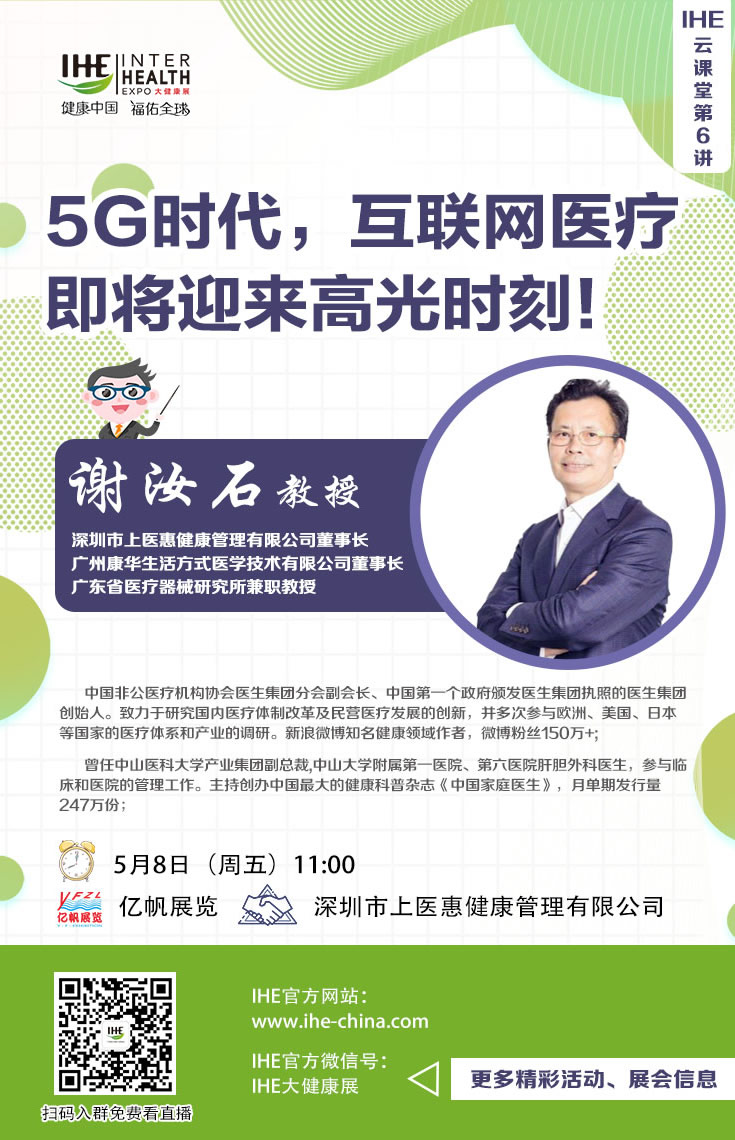 互联网医疗为何在进去能快速发展起来?面对如此大的一个产业集群,我们改如何去切入?本期IHE China云课堂特邀深圳市上医惠健康管理有限公司董事长、广州康华生活方式医学技术有限公司董事长、广东省医疗器械研究所兼职教授谢汝石先生,纵论中国互联网医疗行业的未来趋势及新冠疫情对行业走向的影响。扫描下方二维码观看精彩回放!