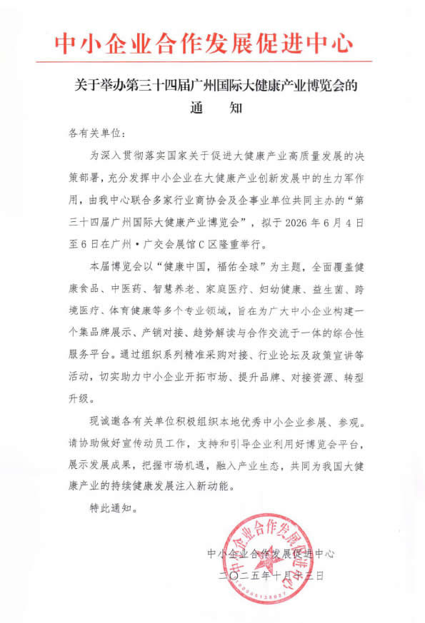为深入贯彻落实国家关于促进大健康产业高质量发展的决策部署,充分发挥中小企业在大健康产业创新发展中的生力军作用,由我中心联合多家行业商协会及企事业单位共同主办的“第三十四届广州国际大健康产业博览会”,拟于2026年6月4日至6日在广州·广交会展馆C区隆重举行。