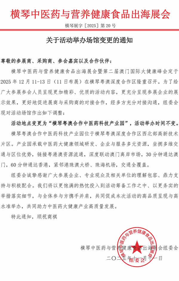 横琴中医药与营养健康食品出海展会暨第二届澳门国际大健康峰会定于2025 年12 月11-13 日(11 日布展)在横琴粤澳深度合作区隆重召开。为了给广大参展参会人员呈现更加精彩、优质的活动内容,更充分呈现参展企业的展示效果,更好地促进展商与采购商的对接合作,经多方充分对接沟通,组委会现对活动场馆作出如下调整: