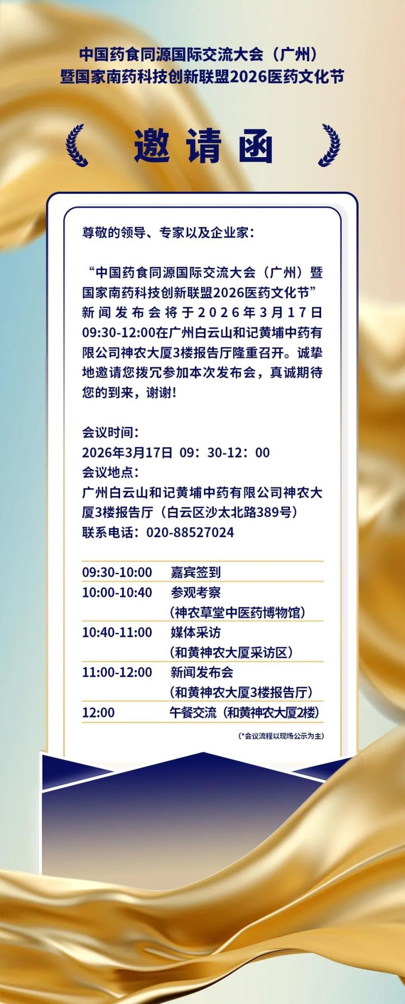 “中国药食同源国际交流大会(广州)暨国家南药科技创新联盟 2026 医药文化节”新闻发布会将于2026年3月17日09:30-12:00在广州白云山和记黄埔中药有限公司神农大厦3楼报告厅隆重召开!诚挚地邀请您拨冗参加本次发布会!真诚期待您的到来!谢谢!