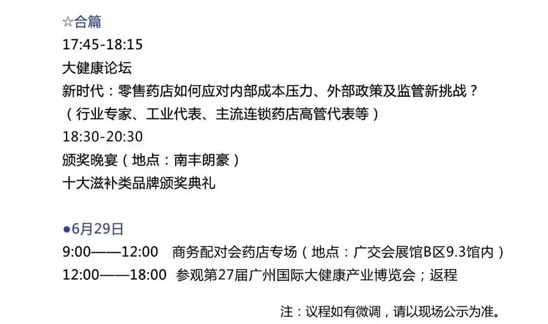 2018“谋定大健康”广州峰会将在6月28-29日再度于第27届广州国际大健康产业博览会(IHE China)期间举办。依托CFDA南方医药经济研究所的权威产业平台与专业研究机构、广东省执业药师协会一流的专业水准、广东省医药零售行业协会强大的号召力和服务能力,以及英富曼意帆展览举办大健康类产品展会的经验与资源,发挥各方优势,强强联合,继续推出“论坛+洽谈”模式峰会,议题涉及大健康产业全景解析、国家机构改革对大健康行业的影响、零售药店大健康领域增长点解读等等。