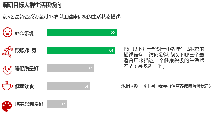 研究报告表明, 中老年群体生活积极向上,其生活方式多,包括旅游、聚会、健身。“心态乐观”和“锻炼健身”是最符合该群体对健康积极的生活状态的描述。