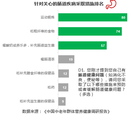 膳食纤维对肠道健康的好处是被关注肠道健康的中老年群体普遍认知的,在认知保持肠道健康所采取措施方面,食用富含纤维食物的排名较高,在受访者中占比达74%,表现出该群体对食用膳食纤维的意愿程度较高。